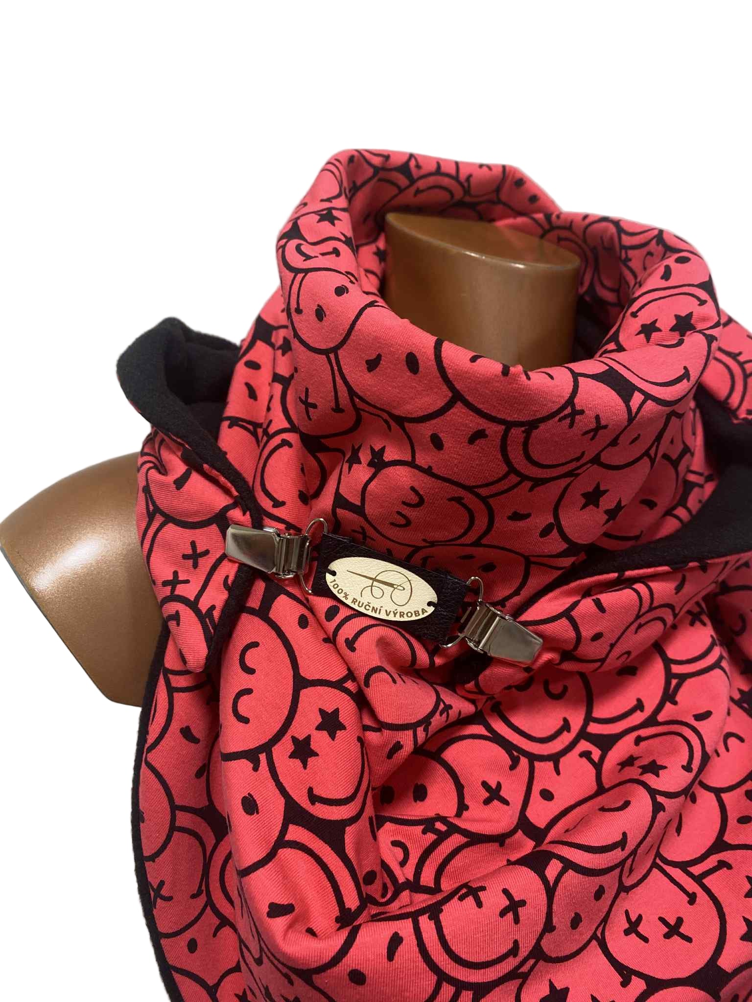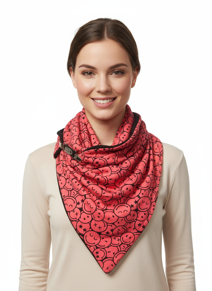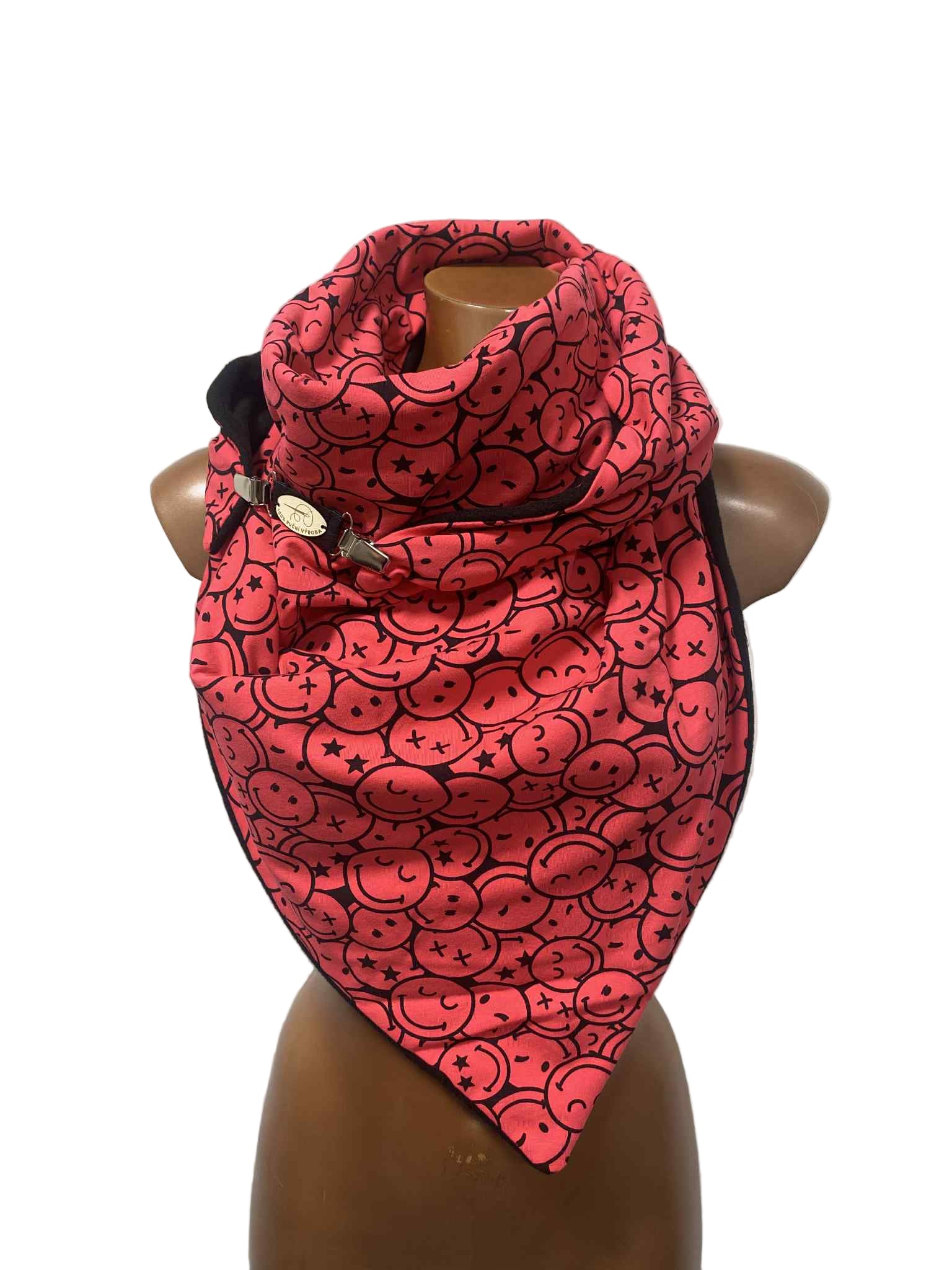 Handmade šátkošála je perfektní doplněk pro chladné dny. Vrchní část je z jemného úpletu, spodní flís poskytuje teplo a pohodlí. Její trojúhelníkový tvar (155 x 120 x 90 cm) a praktické zapínání vám umožní přizpůsobit její velikost podle potřeby.