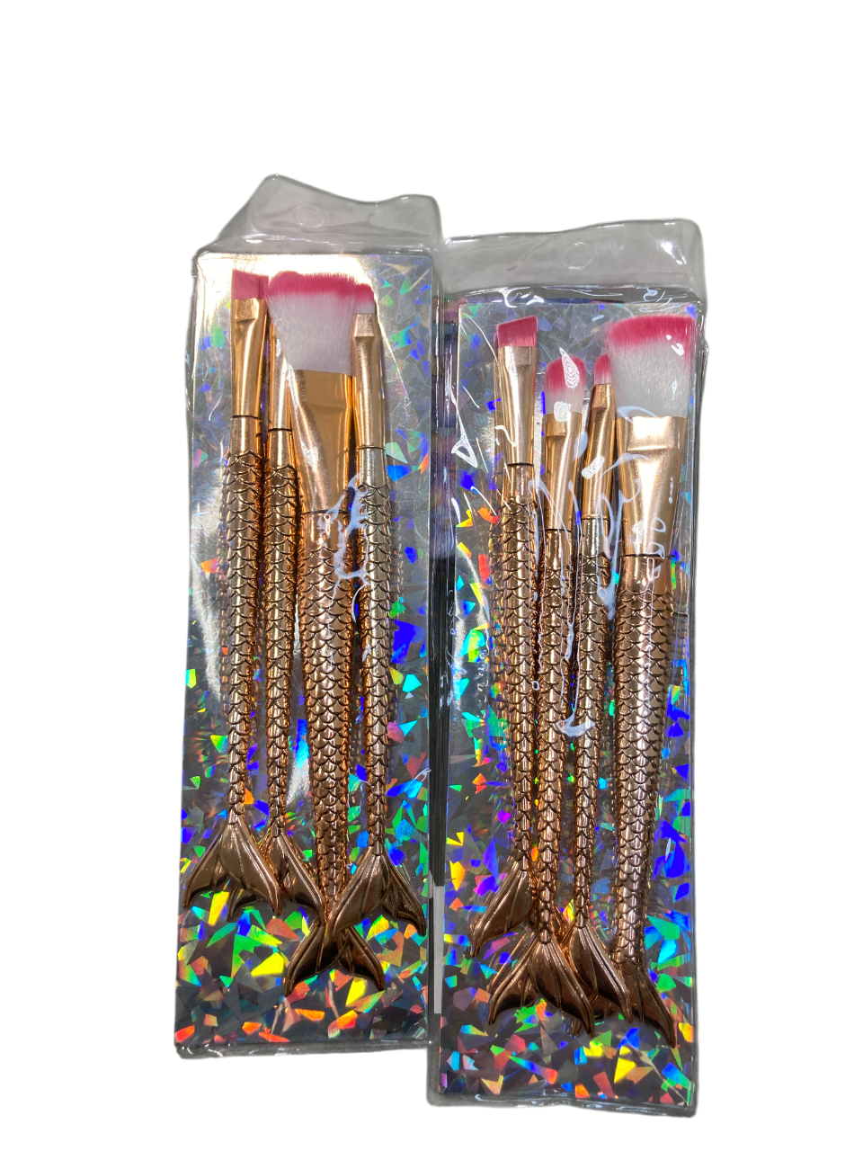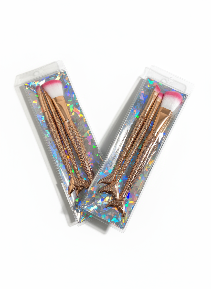 Luxusní sada 4 kosmetických štětců ve stylu mořské panny s elegantními zlatými rukojeťmi. Perfektní volba pro dokonalý make-up i jako stylový dárek.